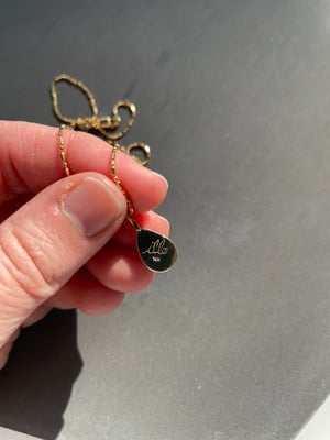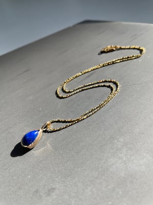 This stunning bright ultramarine Lapis teardrop necklace is handmade, one-of-kind and features a 14k bezel setting on a 16 inch 14k 0.9mm alternating cylinder and round bead chain.